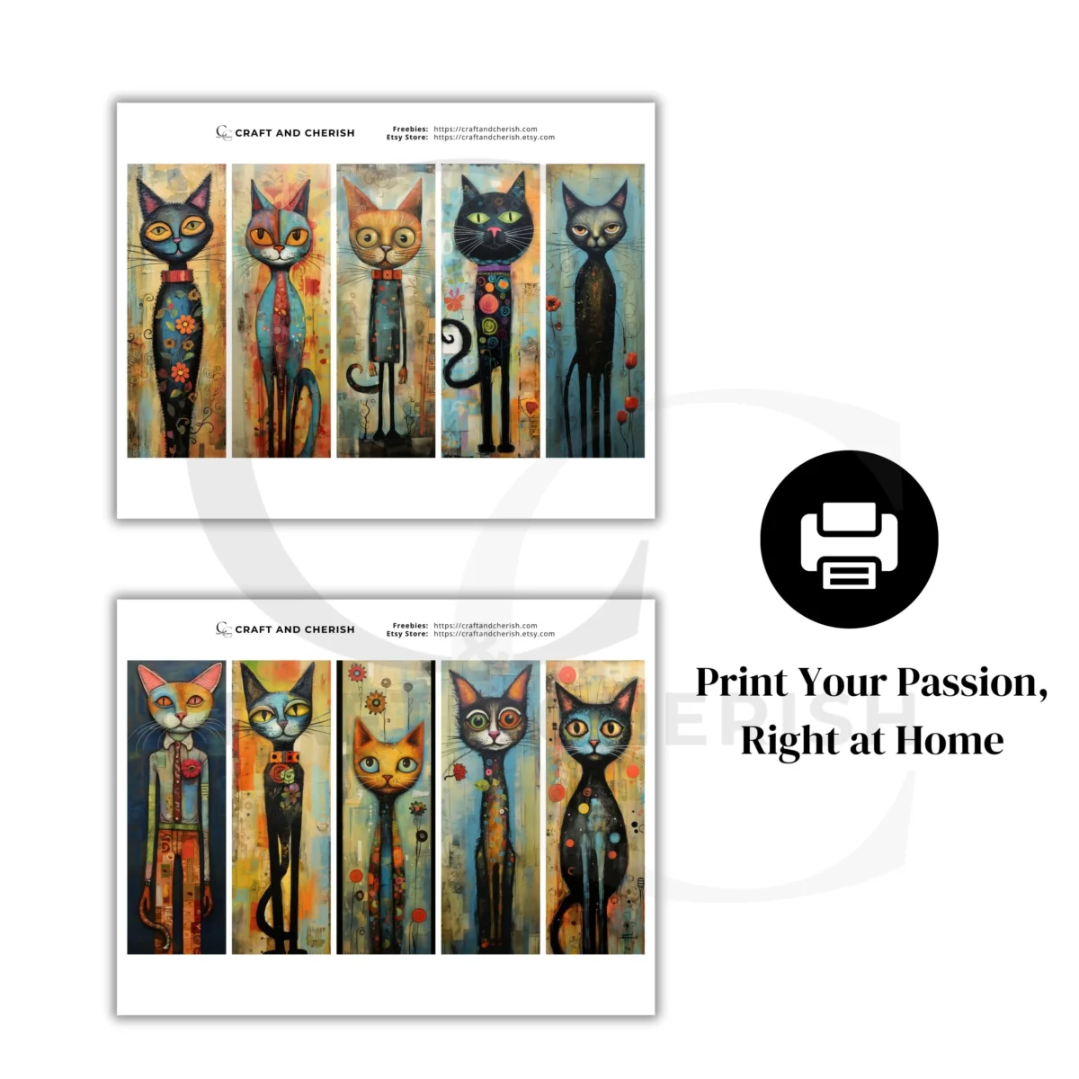 Quirky Cat Bookmark Printable Images – Mixed Media Art, Digital Download for Journals & Scrapbooking