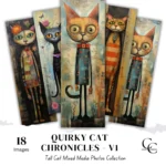 Revisit the charm of whimsical art with our Quirky Cat Chronicles collection, featuring 18 captivating images of tall cat bookmark images. Perfect for adding a quirky touch to your reading and crafting projects.