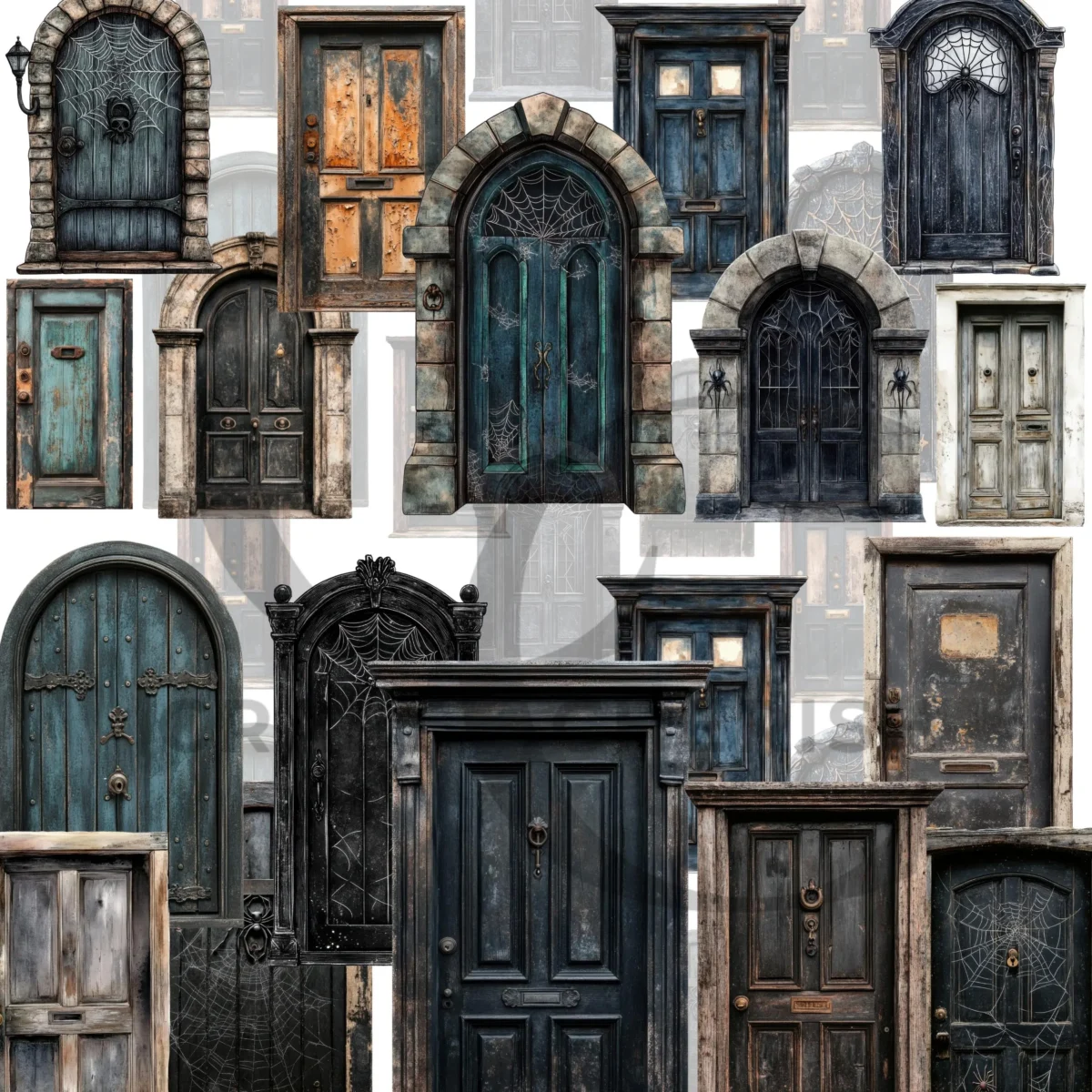Each image features charming, weathered doors with vintage textures, peeling paint, old wood, and cottage-style details — ideal for adding depth, mystery, and storytelling to your artwork.