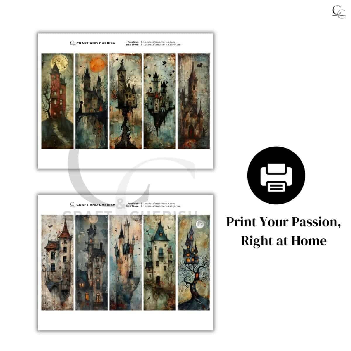 Perfect for junk journals, scrapbooks, altered books, and DIY crafts, these printable bookmarks capture the haunted magic of the season. Use them as journal inserts, tuck-ins, collage elements, or unique Halloween gifts.