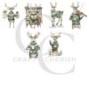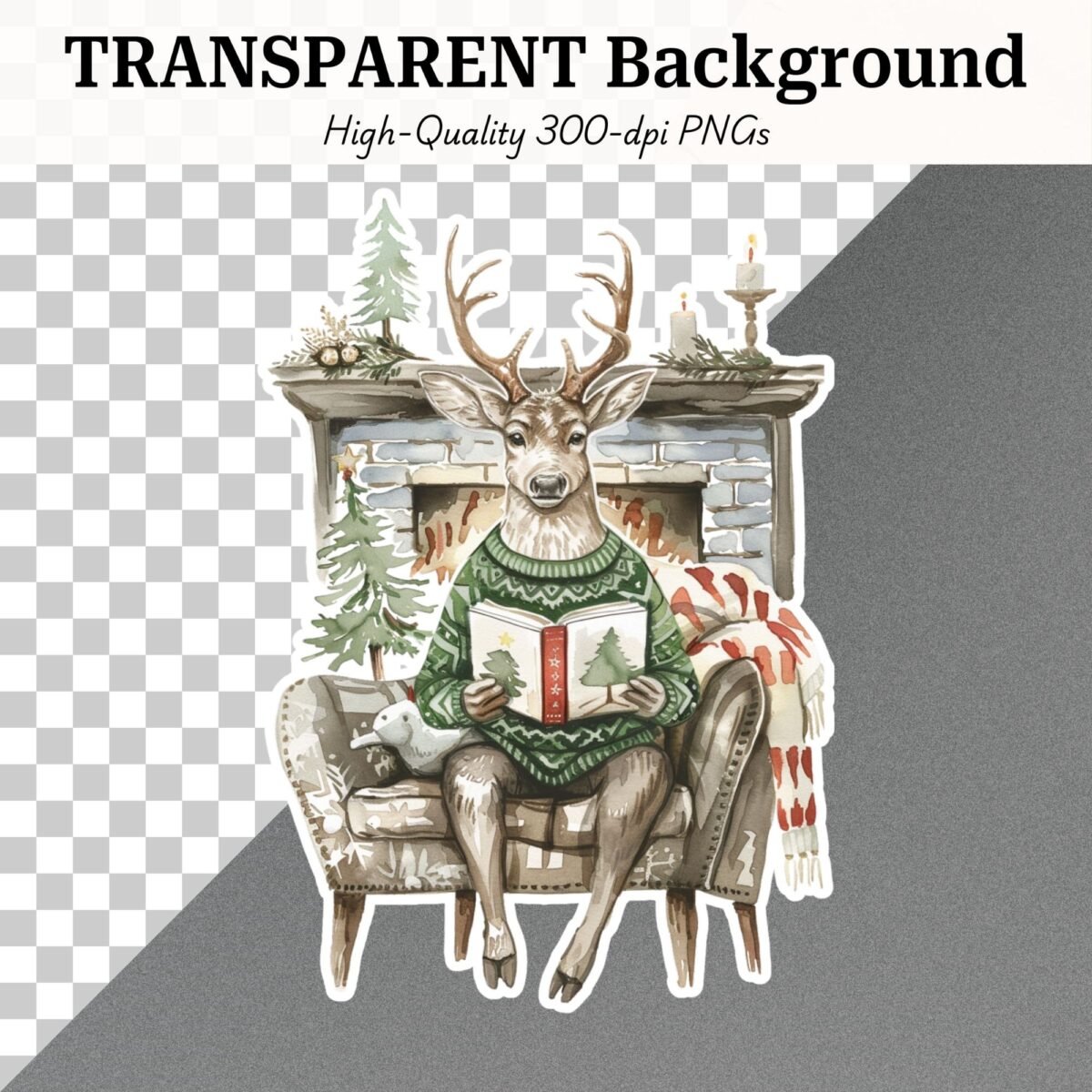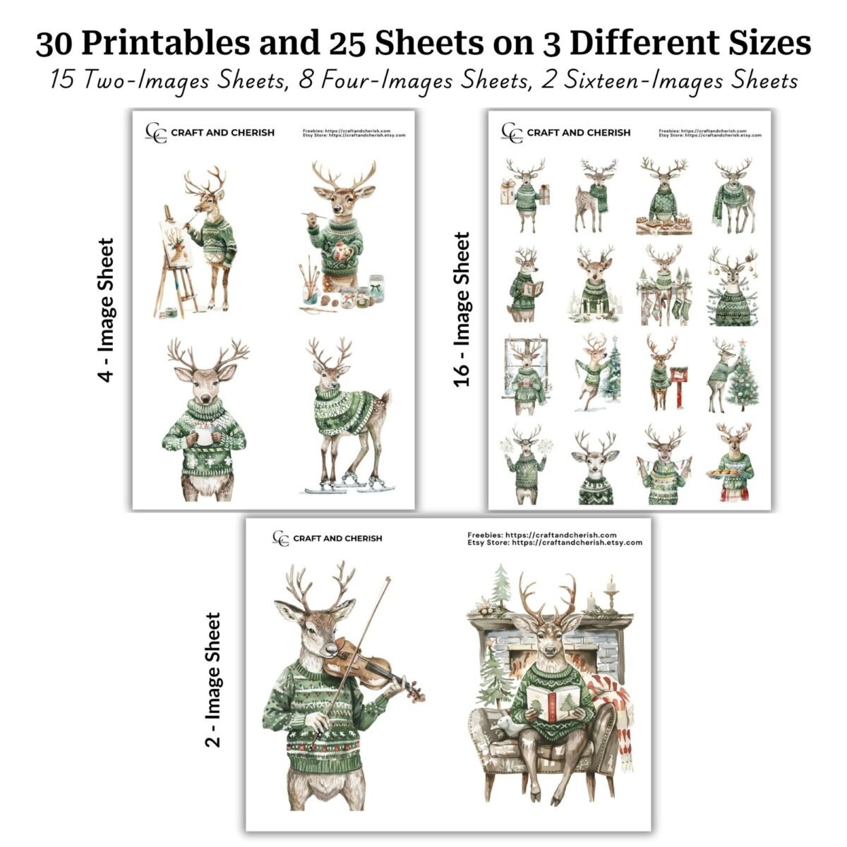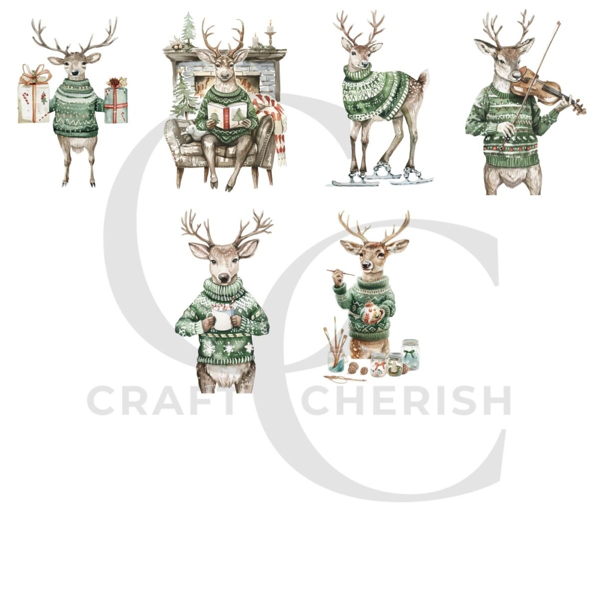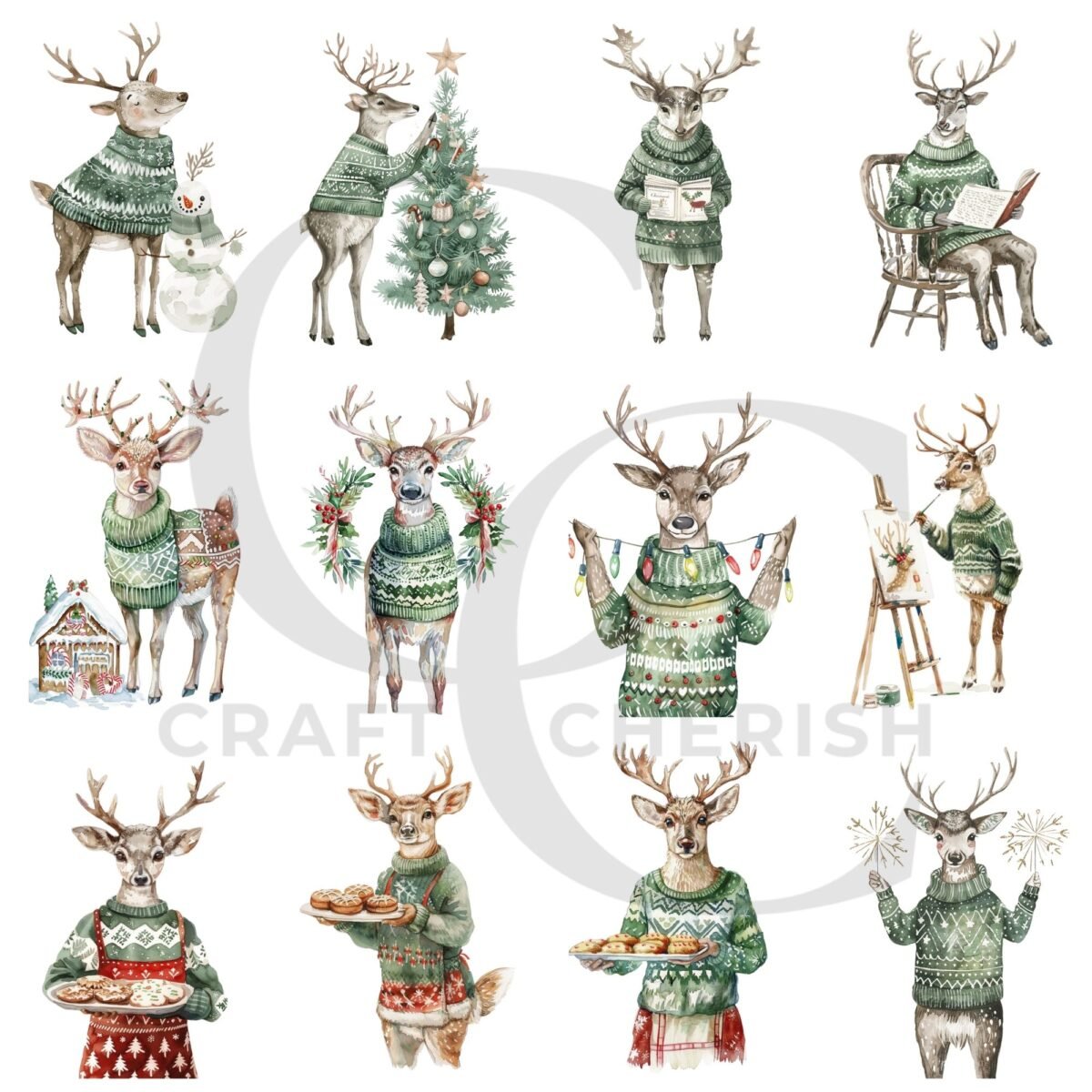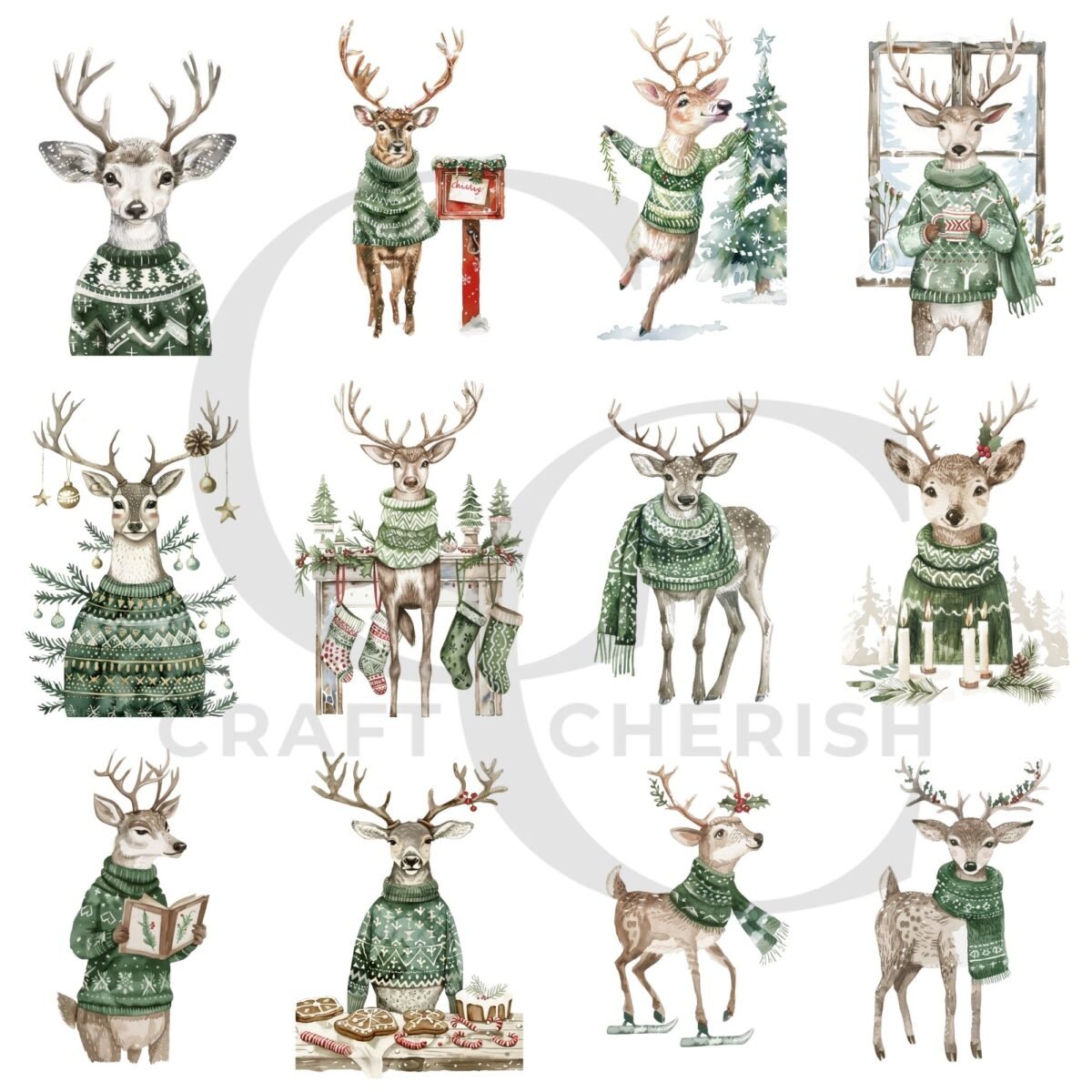 Vintage Christmas Reindeer Printables – Grey Reindeer in Green Sweaters, Watercolor Fussy Cut Images (Digital Download)