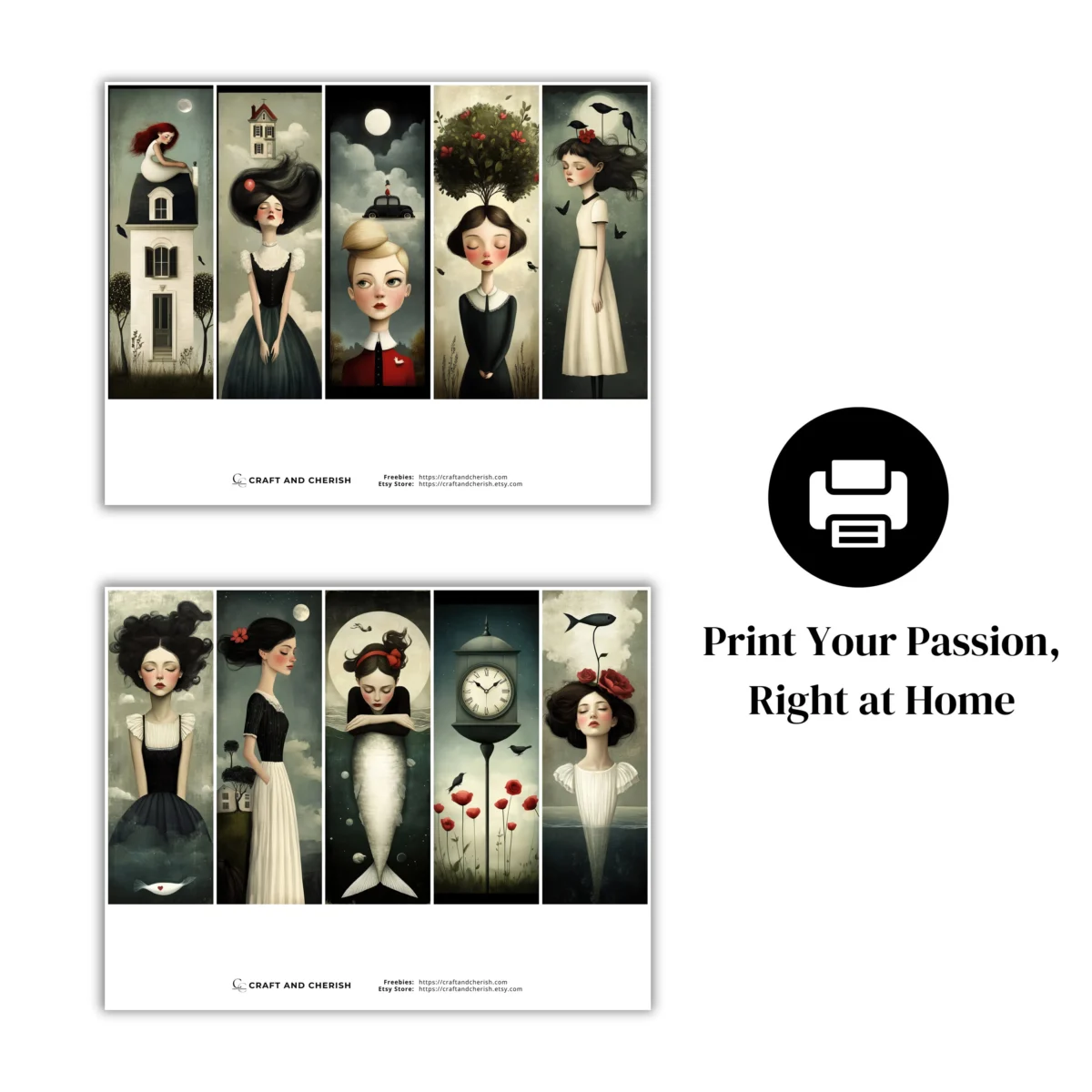 Add a touch of magic and surreal charm to your creations with this set of Whimsical Dream Bookmark Images, featuring beautifully styled vintage surreal couple illustrations. These printable designs blend soft dreamlike elements with nostalgic vintage tones, perfect for adding personality and enchantment to your junk journals, scrapbooks, bookmark collections, mixed-media artwork, and DIY crafting projects. Each image offers a unique combination of romance, whimsy, and surreal storytelling — ideal for anyone who loves artistic journal pages, vintage ephemera, and imaginative collage pieces. The files are delivered in high resolution, ready to print and use instantly.